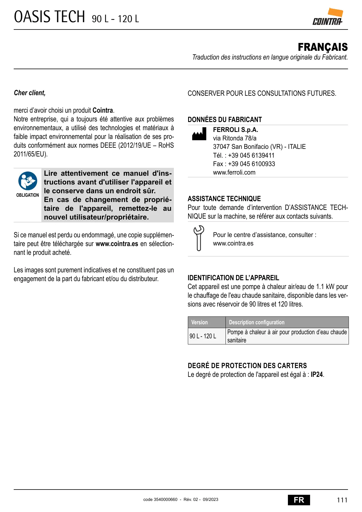 Si ce manuel est perdu où endommagé, une copie supplémen- taire peut être téléchargée sur www.cointra.es en sélection- nant le produit acheté.