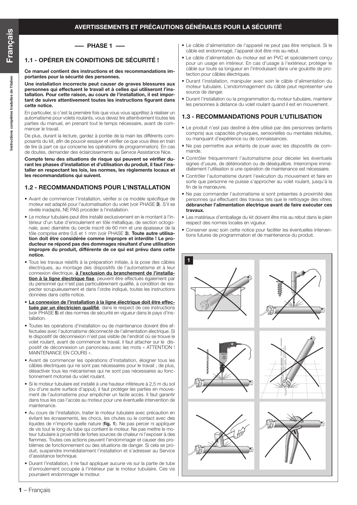 Le moteur tubulaire peut être installé exclusivement en le montant à l'in- térieur d'un tube d'enroulement en tôle métallique, de section octogo- nale, avec diamètre du cercle inscrit de 60 mm et une épaisseur de la tôle comprise entre 0,6 et 1 mm (voir PHASE 3). Toute autre utilisa tion doit être considérée comme impropre et interdite ! Le pro- ducteur ne répond pas des dommages résultant d’une utilisation impropre du produit, différente de ce qui est prévu dans cette notice.