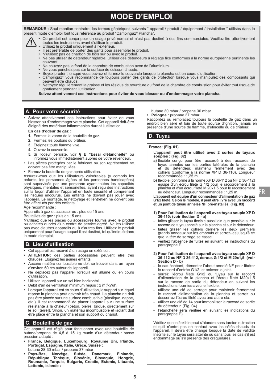 Il est préférable de porter des gants pour assembler le produit. Ne pas utiliser de détendeur réglable. Utliser des détendeurs à réglage fixe conformes à la norme européenne pertinente les. Ne couvrez pas le fond de la chambre de combustion avec de l'aluminium.