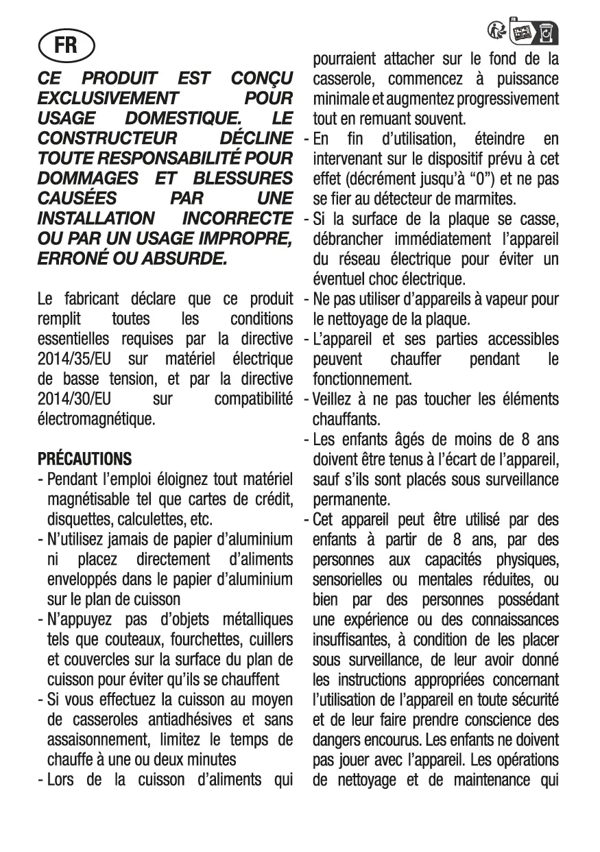INSTALLATION INCORRECTE OÙ PAR UN USAGE IMPROPRE, ERRONÉE OÙ ABSURDE. Le fabricant déclare que ce produit remplit toutes les conditions essentielles requises par la directive 2014/35/EU sur matériel électrique de basse tension, et par la directive 2014/30/EU sur compatibilité électromagnétique. PRÉCAUTIONS - Pendant l'emploi éloignez tout matériel magnétisable tel que cartes de crédit, disquettes, calculettes, etc. - N'utilisez jamais de papier d'aluminium ni placez directement d'aliments enveloppés dans le papier d'aluminium sur le plan de cuisson - N'appuyez pas d'objets métalliques tels que couteaux, fourchettes, cuillers et couvercles sur la surface du plan de cuisson pour éviter qu'ils se chauffent - Si vous effectuez la cuisson au moyen de casseroles antiadhésives et sans assaisonnement, limitez le temps de chauffe à une ou deux minutes -Lors de la cuisson d'aliments qui