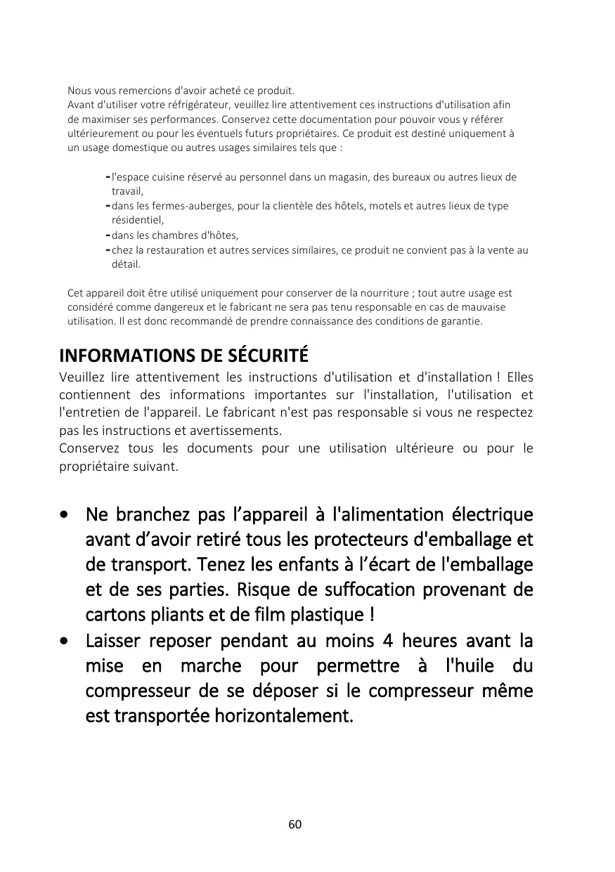 Cet appareil doit être utilisé uniquement pour conserver de la nourriture ; tout autre usage est considéré comme dangereux et le fabricant ne sera pas tenu responsable en cas de mauvaise utilisation. Il est donc recommandé de prendre connaissance des conditions de garantie