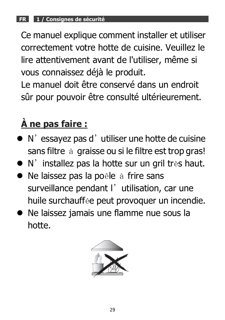 e Ne laissez jamais une flamme nue sous la hotte.