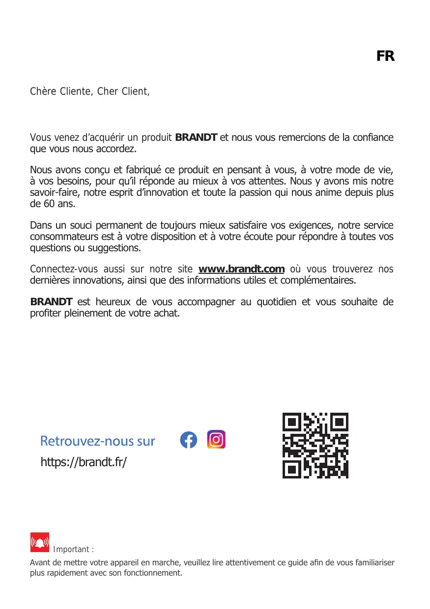 Chère Cliente, Cher Client, Vous venez d'acquérir un produit BRANDT et nous vous remercions de la confiance que vous nous accordez. Nous avons conçu et fabriqué ce produit en pensant à vous, à votre mode de vie, à vos besoins, pour qu'il réponde au mieux à vos attentes. Nous y avons mis notre savoir-faire, notre esprit d'innovation et toute la passion qui nous anime depuis plus de 60 ans. Dans un souci permanent de toujours mieux satisfaire vos exigences, notre service consommateurs est à votre disposition et à votre écoute pour répondre à toutes vos questions ou suggestions. Connectez-vous aussi sur notre site www.brandt.com où vous trouverez nos dernières innovations, ainsi que des informations utiles et complémentaires. BRANDT est heureux de vous accompagner au quotidien et vous souhaite de profiter pleinement de votre achat. Retrouvez-nous sur © (©) https://brandt.fr/ (Ft) Important : Avant de mettre votre appareil en marche, veuillez lire attentivement ce guide afin de vous familiariser plus rapidement avec son fonctionnement.