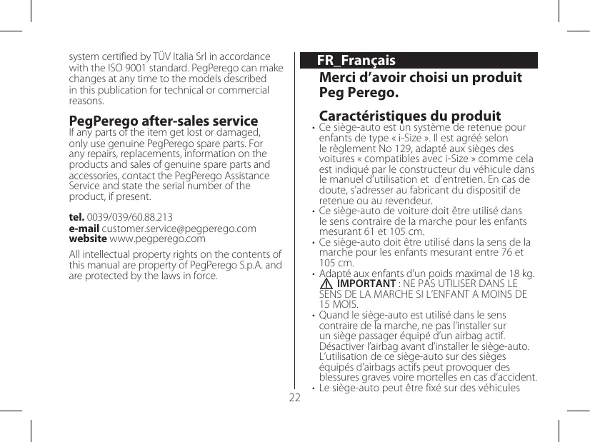 | Pièces détachées et réparabilité | Disponibilité de pièces de rechange via le service client Peg Perego |