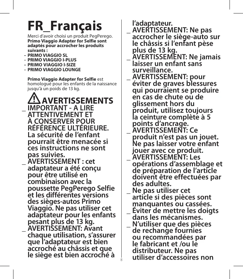 | Compatibilités | Compatible avec les poussettes PEG PEREGO Selfie |