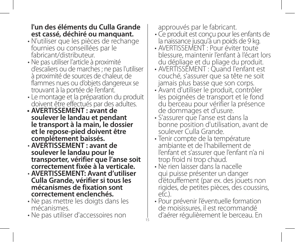 Assurez-vous que votre bébé est toujours attaché avec les harnais de sécurité fournis et ne laissez jamais l'enfant sans surveillance dans le Culla Grande.