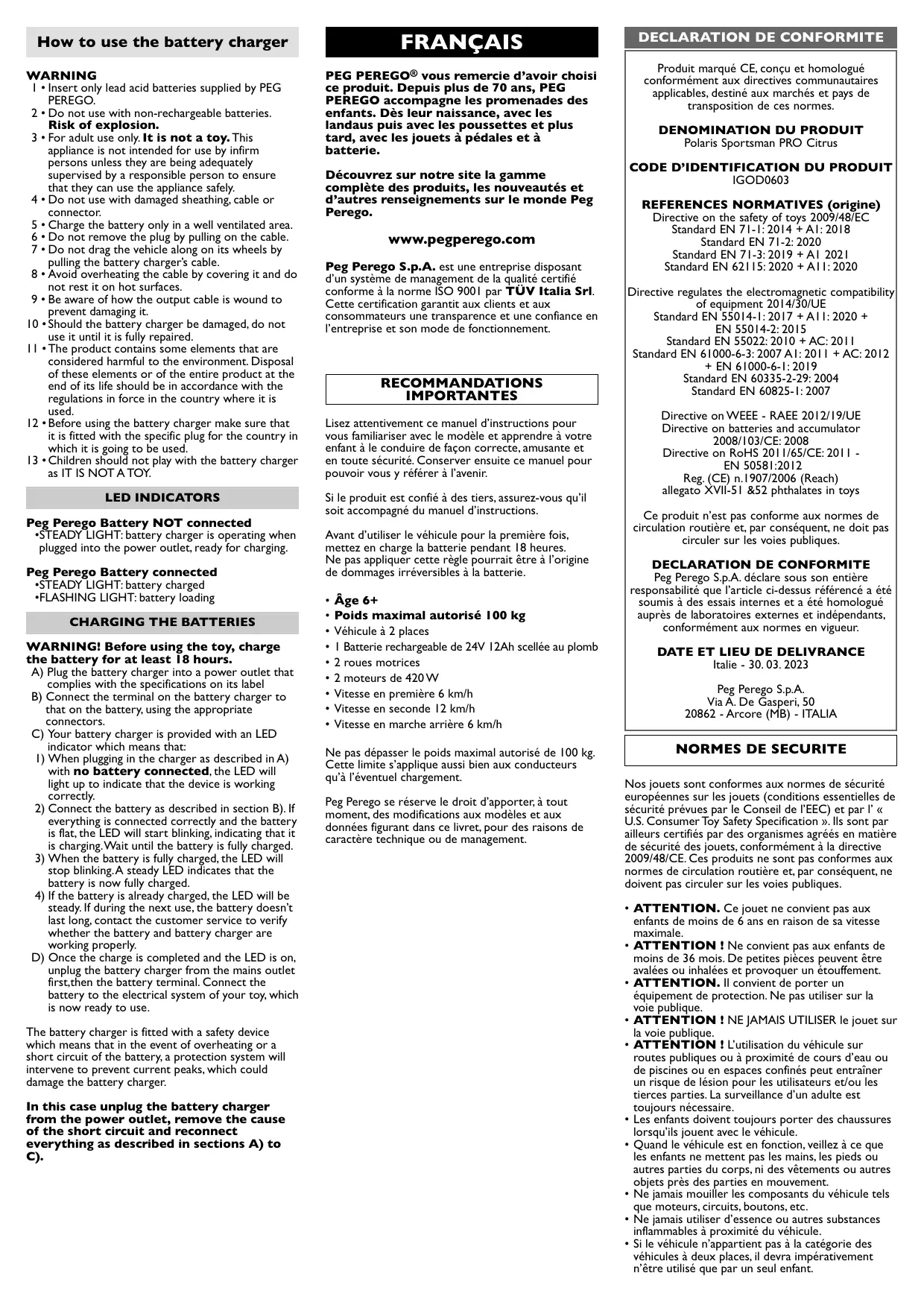 Téléchargez la notice de votre QUAD POUR ENFANTS au format PDF gratuitement ! Retrouvez votre notice Polaris Sportsman PRO Citrus - PEG PEREGO et reprennez votre appareil électronique en main. Sur cette page sont publiés tous les documents nécessaires à l'utilisation de votre appareil Polaris Sportsman PRO Citrus de la marque PEG PEREGO.