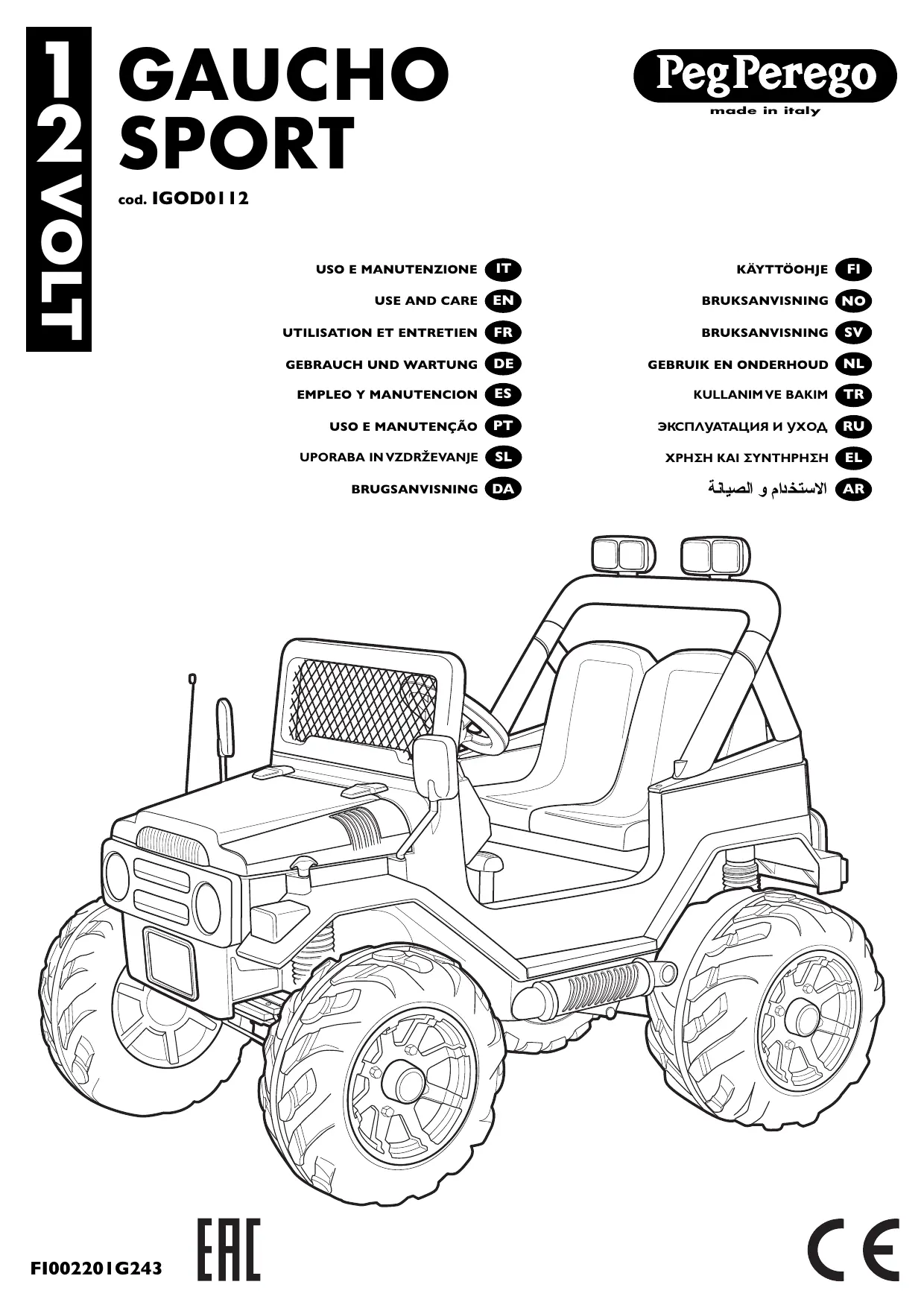 Téléchargez la notice de votre TOUT TERRAIN au format PDF gratuitement ! Retrouvez votre notice Gaucho Sport - PEG PEREGO et reprennez votre appareil électronique en main. Sur cette page sont publiés tous les documents nécessaires à l'utilisation de votre appareil Gaucho Sport de la marque PEG PEREGO.