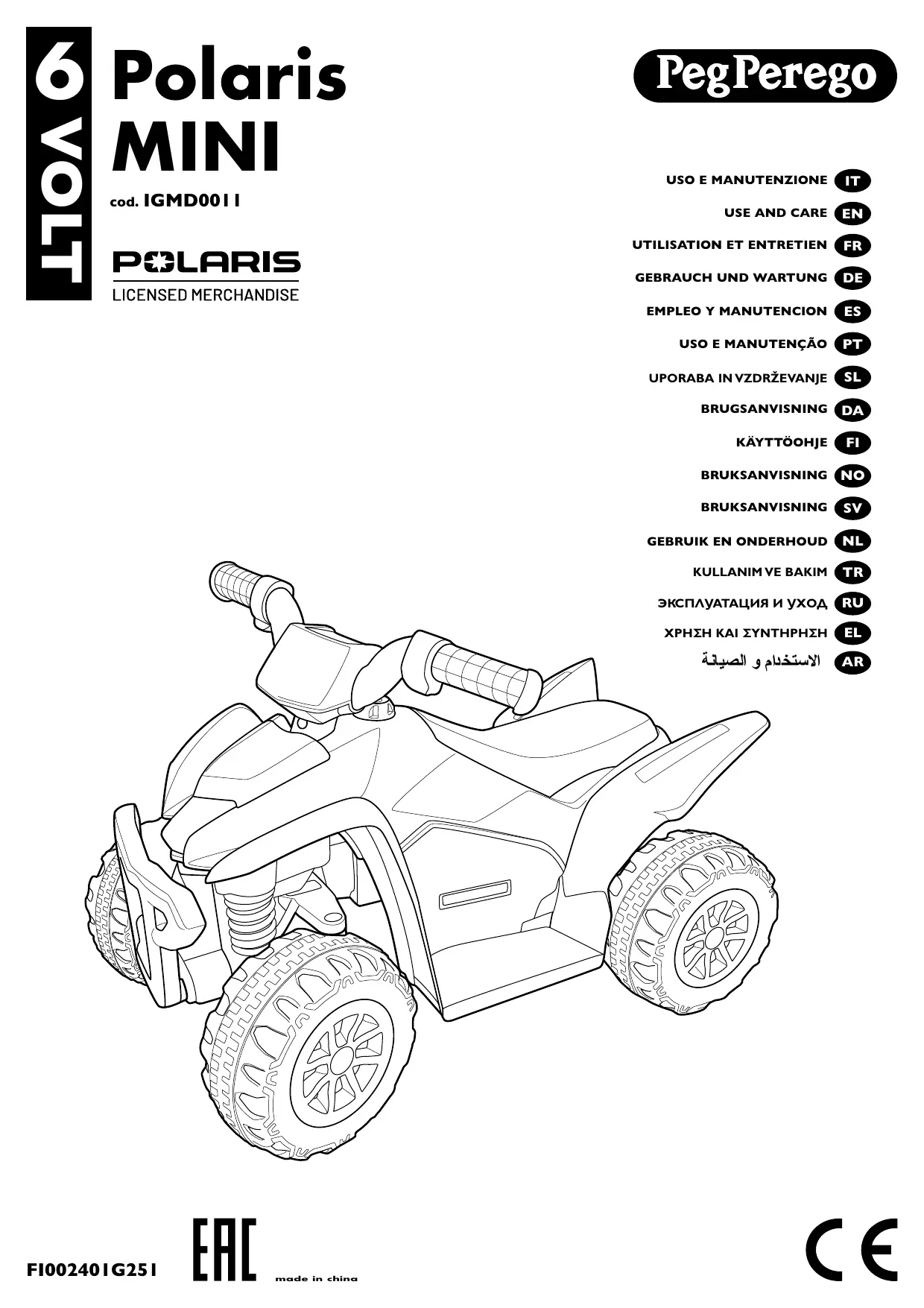 Téléchargez la notice de votre TOUT TERRAIN au format PDF gratuitement ! Retrouvez votre notice Polaris Mini - PEG PEREGO et reprennez votre appareil électronique en main. Sur cette page sont publiés tous les documents nécessaires à l'utilisation de votre appareil Polaris Mini de la marque PEG PEREGO.