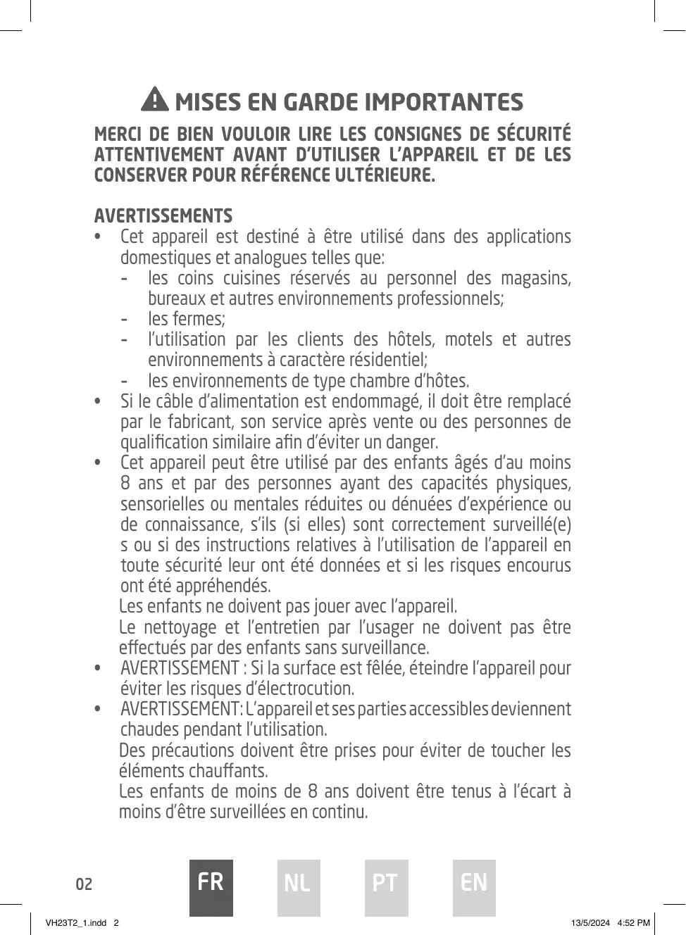 + AVERTISSEMENT: L'appareil et ses parties accessibles deviennent chaudes pendant l'utilisation.