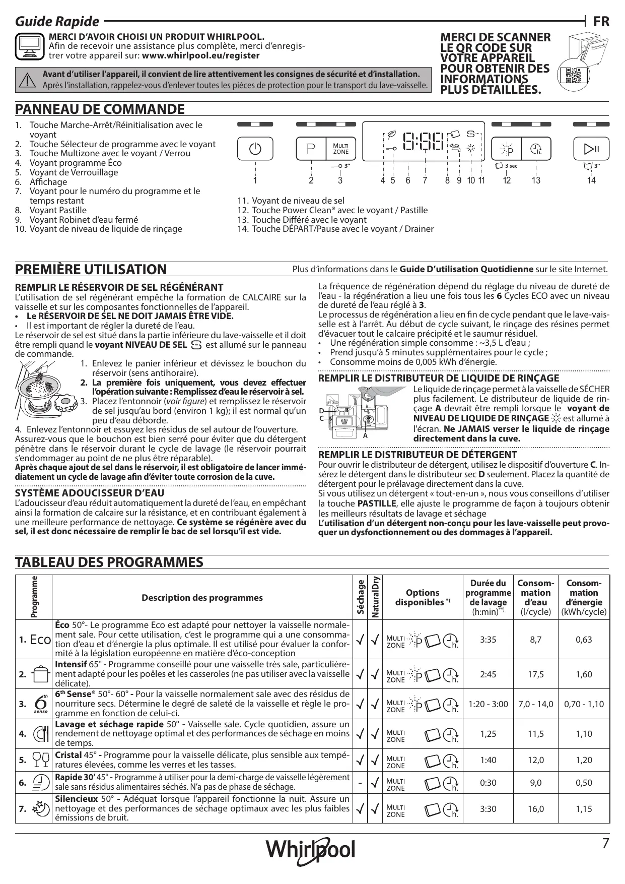 trer votre appareil sur: www.whirlpool.eu/register PANNEAU DE COMMANDE