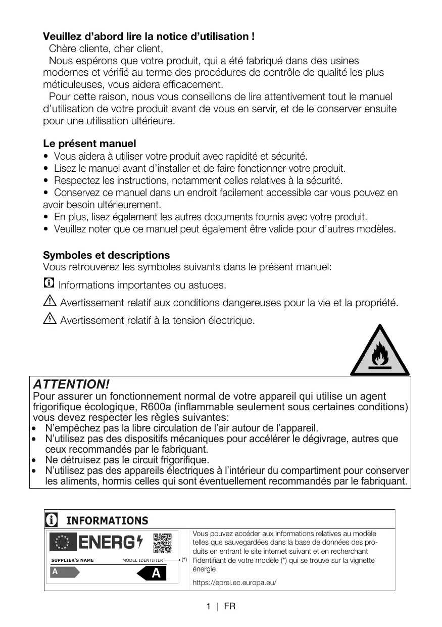 Le type de gaz utilisé dans l'appareil est mentionné sur la plaque signalétique située sur la paroi gauche de l'intérieur du réfrigérateur.