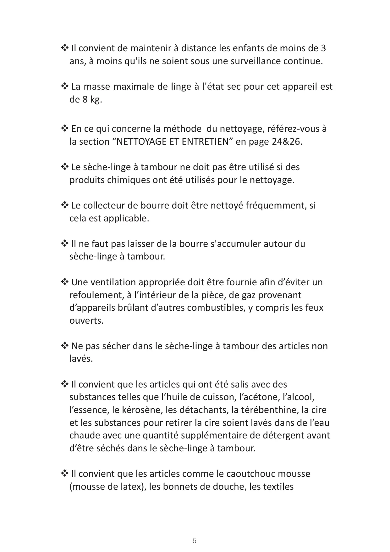 “ Le sèche-linge à tambour ne doit pas être utilisé si des produits chimiques ont été utilisés pour le nettoyage.