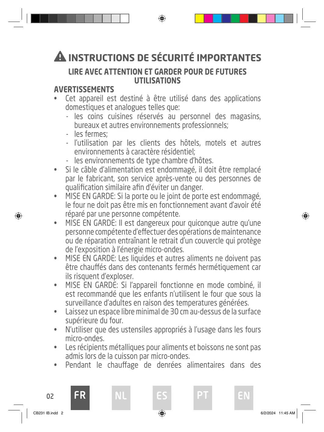 + MISE EN GARDE: Si l'appareil fonctionne en mode combiné, il est recommandé que les enfants n'utilisent le four que sous la surveillance d'adultes en raison des temperatures générées.