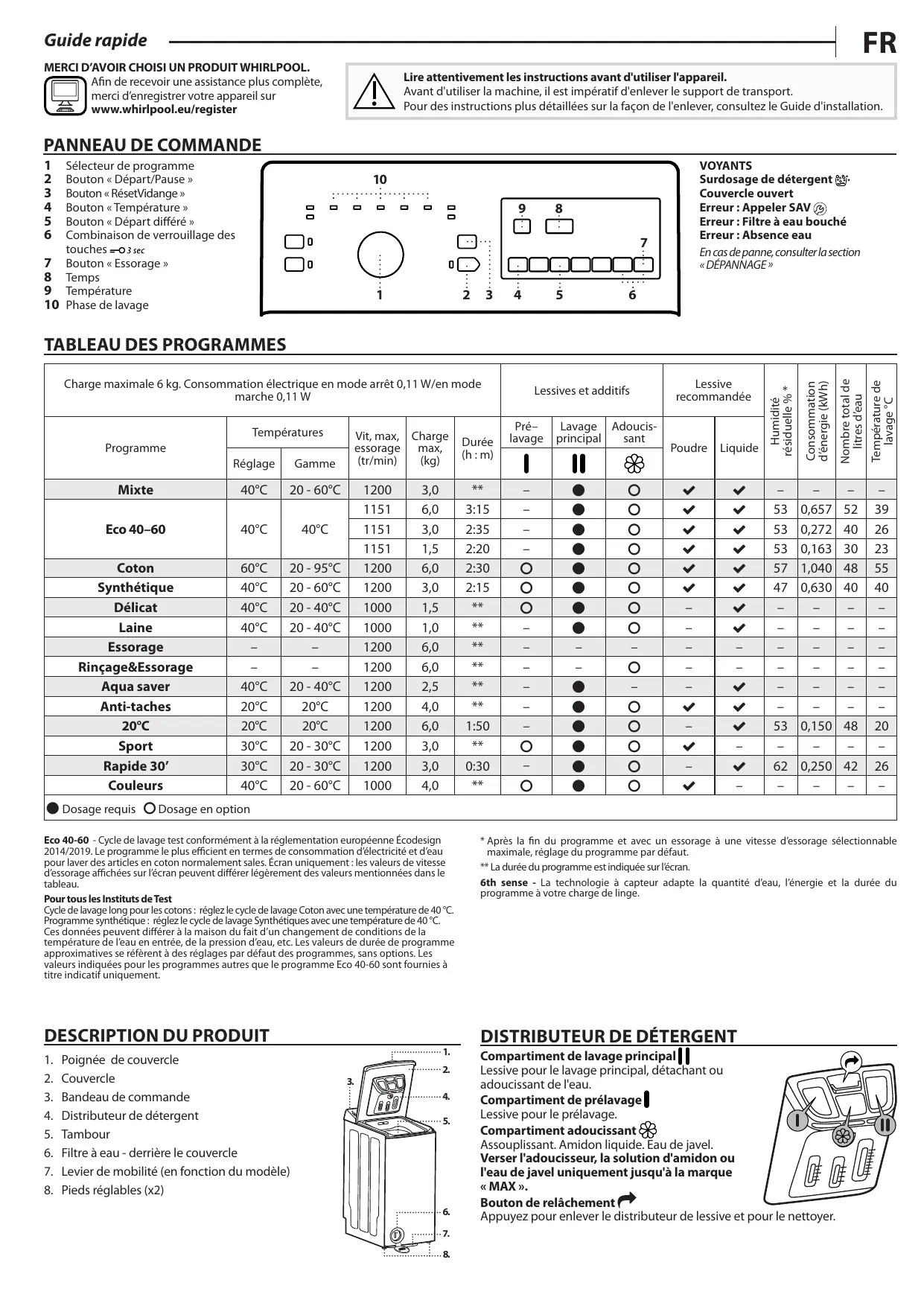 Guide rapide MER( AVOIR CHOISI UN PRODUIT WHIRLPOOL. Afin de recevoir une assistance plus complète, merci d'enregistrer votre appareil sur www.whiripool.eu/register