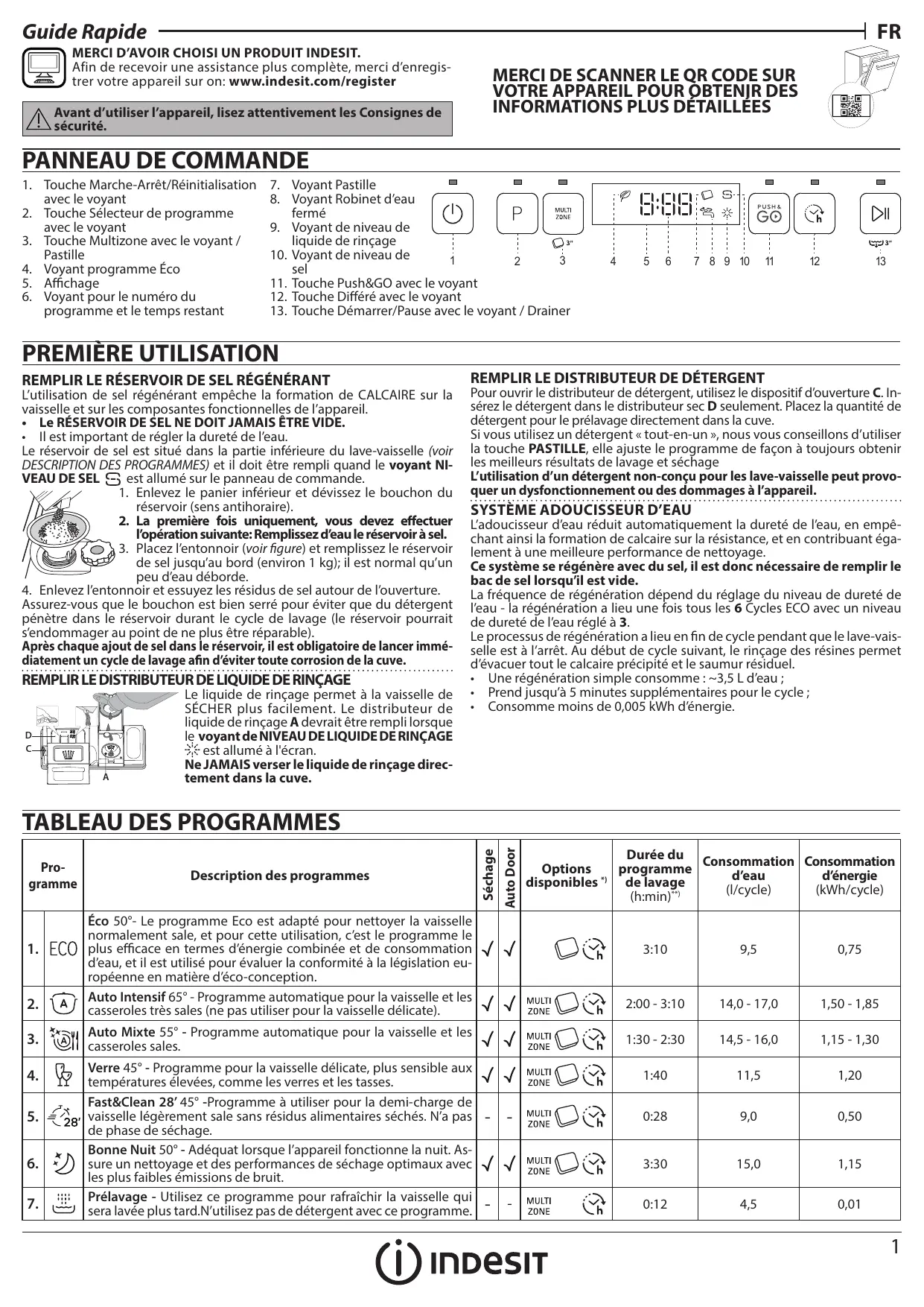 Guide Rapide MERCI D'AVOIR CHOISI UN PRODUIT INDESIT. Afin de recevoir une assistance plus complète, merci d'enregis- Æ ) trer votre appareil sur on: www.indesit.com/register Avant d'utiliser l'appareil, lisez attentivement les Consignes de sécurité. MERCI DE SCANNER LE OR CODE SUR
