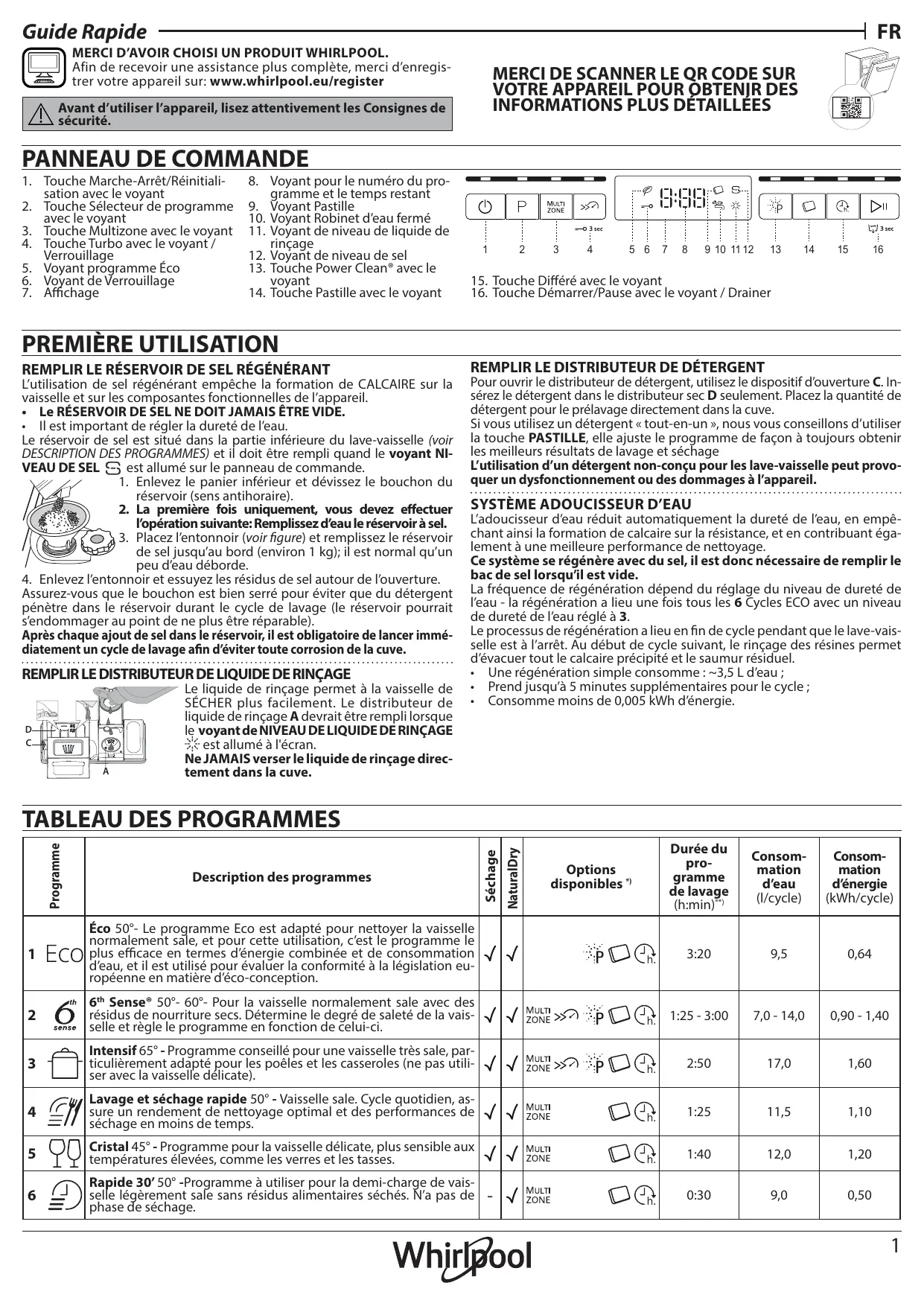 Guide Rapide CO) MERCI D'AVOIR CHOISI UN PRODUIT WHIRLPOOL. Afin de recevoir une assistance plus complète, merci d'enregis- trer votre appareil sur: www.whirlpool.eu/register Avant d'u: sécurité. iser l'appareil, lisez attentivement les Consignes de MERCI DE SCANNER LE QR CODE SUR