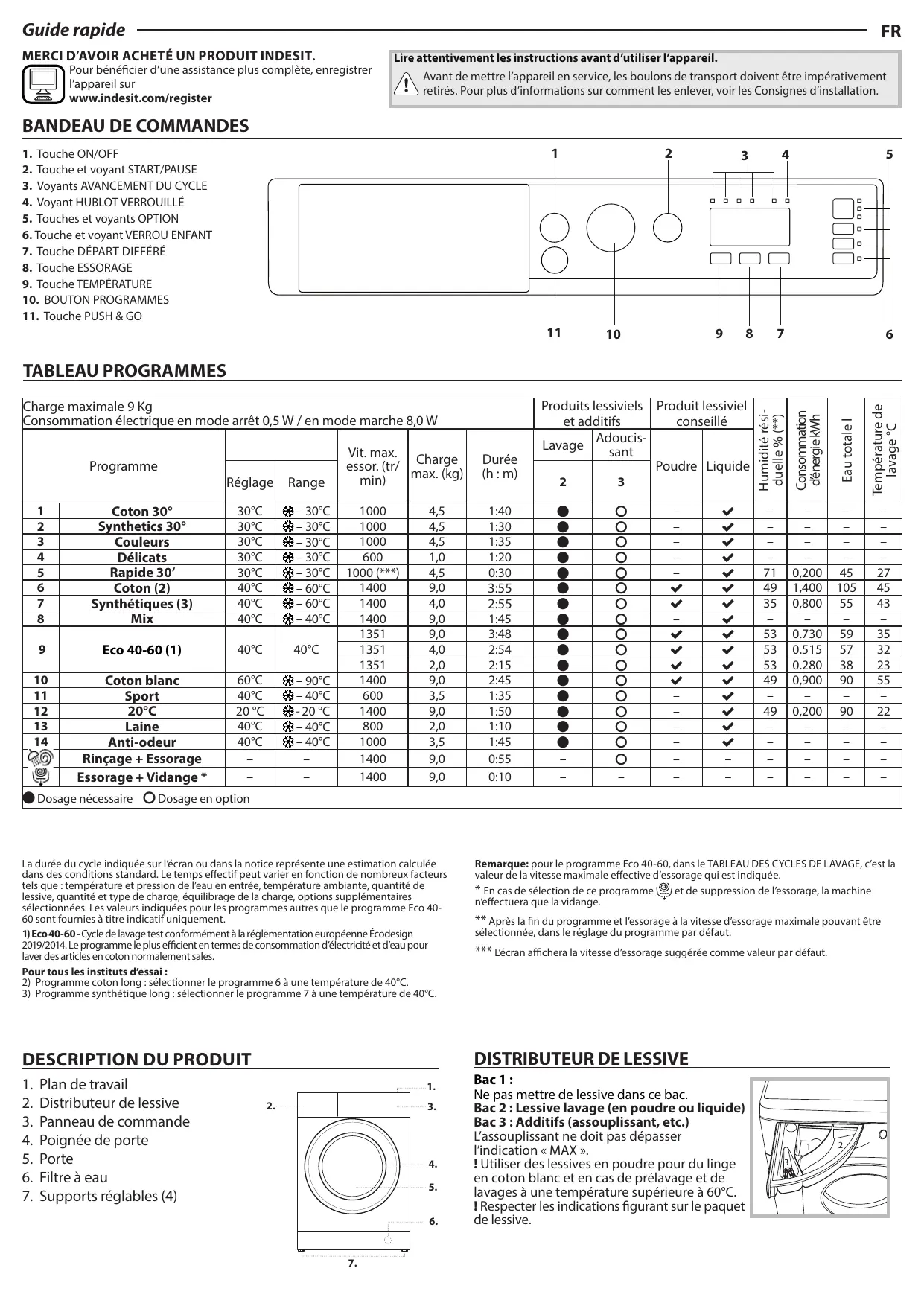 DESCRIPTION DU PRODUIT Remarque: pour le programme Eco 40-60, dans le TABLEAU DES CYCLES DE LAVAGE, c'est la