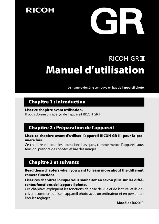 Lisez ce chapitre avant d'utiliser pour la pre- mière Ce chapitre explique les opérations basiques, comme mettre l'appareil sous tension, prendre des photos et lire des images. Read these chapters when you want to learn more about the different camera functions. ez ces chapitres lorsque vous souhaitez en savoir plus sur les diffé- rentes fonctions de l'appareil photo. Ces chapitres expliquent les fonctions de prise de vue et de lecture, et ils dé- crivent comment utiliser l'appareil photo avec un ordinateur et en personna- liser les réglages. Modèle : RO2010