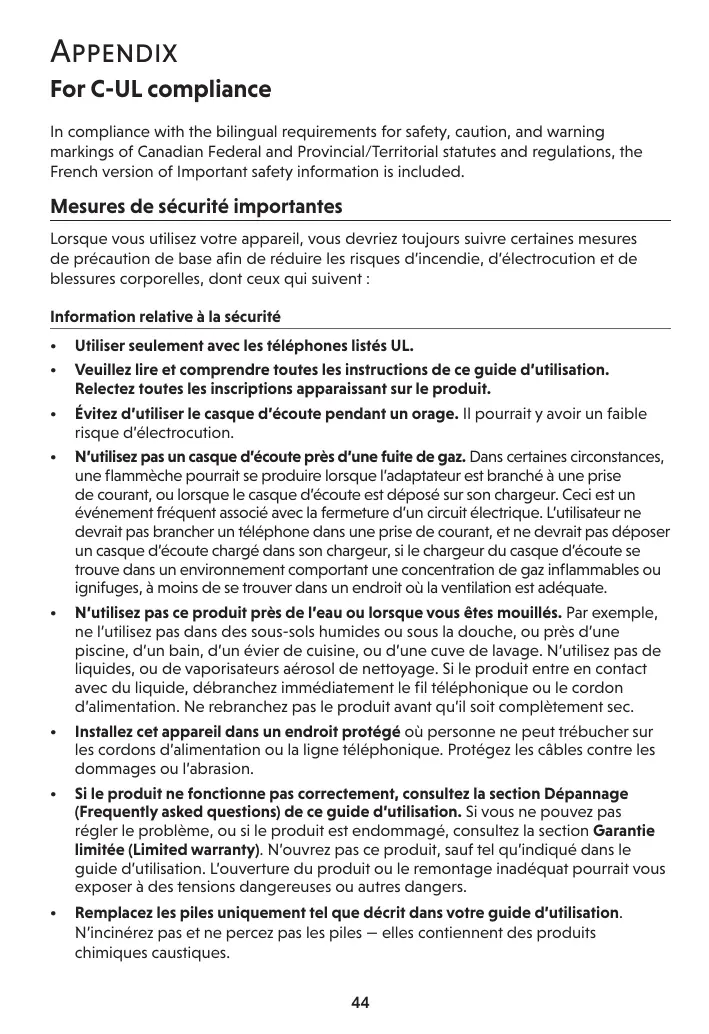 + Alimentation électrique : La base de ce téléphone sans fil (de ce casque d'écoute sans fi) doit être branchée à une prise de courant électrique fonctionnelle. La prise électrique ne doit pas être contrôlée par un interrupteur mural. Les appels ne peuvent pas être effectués à partir du socle du casque d'écoute n'est pas branchée,