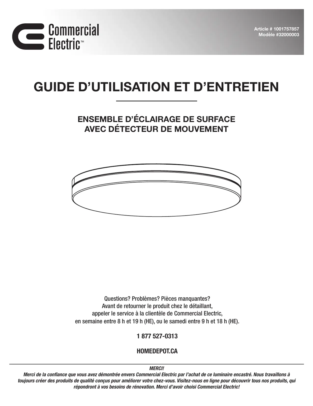 GUIDE D'UTILISATION ET D'ENTRETIEN ENSEMBLE D'ÉCLAIRAGE DE SURFACE AVEC DÉTECTEUR DE MOUVEMENT Questions? Problèmes? Pièces manquantes? Avant de retourner le produit chez le détaillant, appeler le service à la clientèle de Commercial Electric, en semaine entre 8 h et 19 h (HE), ou le samedi entre 9 h et 18 h (HE).