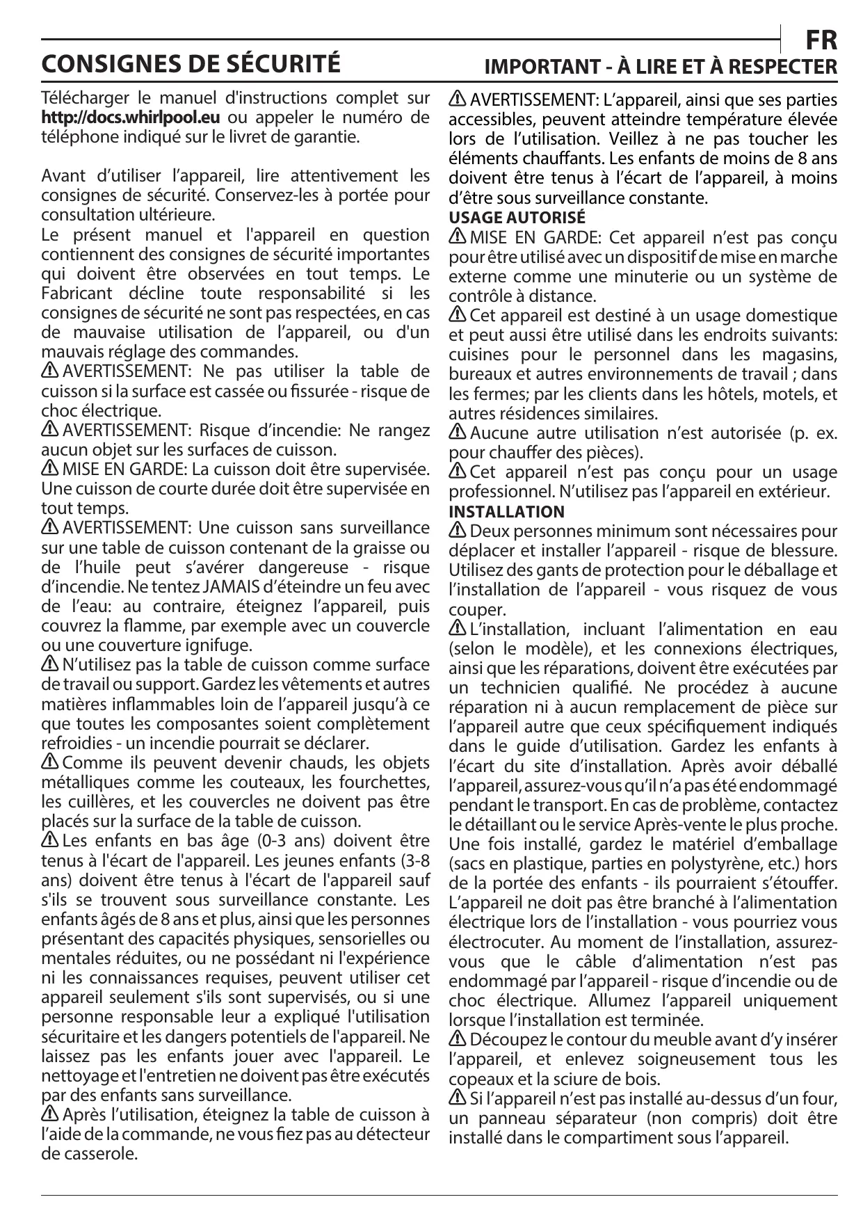 Télécharger le manuel d'instructions complet sur http://docs.whirlpool.eu ou appeler le numéro de téléphone indiqué sur le livret de garantie. Avant d'utiliser l'appareil, lire attentivement les consignes de sécurité. Conservez-les à portée pour consultation ultérieure. Le présent manuel et l'appareil en question contiennent des consignes de sécurité importantes qui doivent être observées en tout temps. Le Fabricant décline toute responsabilité si les consignes de sécurité ne sont pas respectées, en cas de mauvaise utilisation de l'appareil, où d'un mauvais réglage des commandes. & AVERTISSEMENT: Ne pas utiliser la table de cuisson si la surface est cassée ou fissurée - risque de choc électrique. & AVERTISSEMENT: Risque d'incendie: Ne rangez aucun objet sur les surfaces de cuisson. & MISE EN GARDE: La cuisson doit être supervisée. Une cuisson de courte durée doit être supervisée en tout temps. & AVERTISSEMENT: Une cuisson sans surveillance sur une table de cuisson contenant de la graisse ou de l'huile peut s'avérer dangereuse - risque d'incendie. Ne tentez JAMAIS d'éteindre un feu avec de l'eau: au contraire, éteignez l'appareil, puis couvrez la flamme, par exemple avec un couvercle ou une couverture ignifuge. & N'utilisez pas la table de cuisson comme surface de travail ou support. Gardez les vêtements et autres matières inflammables loin de l'appareil jusqu'à ce que toutes les composantes soient complètement refroidies - un incendie pourrait se déclarer. A Comme ils peuvent devenir chauds, les objets métalliques comme les couteaux, les fourchettes, les cuillères, et les couvercles ne doivent pas être placés sur la surface de la table de cuisson. Les enfants en bas âge (0-3 ans) doivent être tenus à l'écart de l'appareil. Les jeunes enfants (3-8 ans) doivent être tenus à l'écart de l'appareil sauf s'ils se trouvent sous surveillance constante. Les enfants âgés de 8 ans et plus, ainsi que les personnes présentant des capacités physiques, sensorielles ou mentales réduites, ou ne possédant ni l'expérience ni les connaissances requises, peuvent utiliser cet appareil seulement s'ils sont supervisés, ou si une personne responsable leur a expliqué l'utilisation sécuritaire et les dangers potentiels de l'appareil. Ne laissez pas les enfants jouer avec l'appareil. Le nettoyage et l'entretien ne doivent pas être exécutés par des enfants sans surveillance. & Après l'utilisation, éteignez la table de cuisson à l'aide de la commande, ne vous fiez pas au détecteur de casserole. & AVERTISSEMENT: L'appareil, ainsi que ses parties accessibles, peuvent atteindre température élevée lors de l’utilisation. Veillez à ne pas toucher les éléments chauffants. Les enfants de moins de 8 ans doivent être tenus à l'écart de l'appareil, à moins d'être sous surveillance constante. USAGE AUTORISÉ MISE EN GARDE: Cet appareil n'est pas conçu pour être utilisé avec un dispositif de mise en marche externe comme une minuterie ou un système de contrôle à distance. À Cet appareil est destiné à un usage domestique et peut aussi être utilisé dans les endroits suivants: cuisines pour le personnel dans les magasins, bureaux et autres environnements de travail ; dans les fermes; par les clients dans les hôtels, motels, et autres résidences similaires. À Aucune autre utilisation n'est autorisée (p. ex. pour chauffer des pièces). & Cet appareil n'est pas conçu pour Un usage professionnel. N'utilisez pas l'appareil en extérieur. INSTALLATION & Deux personnes minimum sont nécessaires pour déplacer et installer l'appareil - risque de blessure. Utilisez des gants de protection pour le déballage et l'installation de l'appareil - vous risquez de vous couper. À L'installation, incluant l'alimentation en eau (selon le modèle), et les connexions électriques, ainsi que les réparations, doivent être exécutées par un technicien qualifié Ne procédez à aucune réparation ni à aucun remplacement de pièce sur l'appareil autre que ceux spécifiquement indiqués dans le guide d'utilisation. Gardez les enfants à l'écart du site d'installation. Après avoir déballé l'appareil, assurez-vous qu'il n'a pas été endommagé pendant le transport. En cas de problème, contactez le détaillant ou le service Après-vente le plus proche. Une fois installé, gardez le matériel d'emballage (sacs en plastique, parties en polystyrène, etc.) hors de la portée des enfants - ils pourraient s'étouffer. L'appareil ne doit pas être branché à l'alimentation électrique lors de l'installation - vous pourriez vous électrocuter. Au moment de l'installation, assurez- vous que le cäble d'alimentation n'est pas endommagé par l'appareil - risque d'incendie ou de choc électrique. Allumez l'appareil uniquement lorsque l'installation est terminée. & Découpez le contour du meuble avant d'y insérer l'appareil, et enlevez soigneusement tous les copeaux et la sciure de bois. Si l'appareil n'est pas installé au-dessus d’un four, un panneau séparateur (non compris) doit être installé dans le compartiment sous l'appareil.