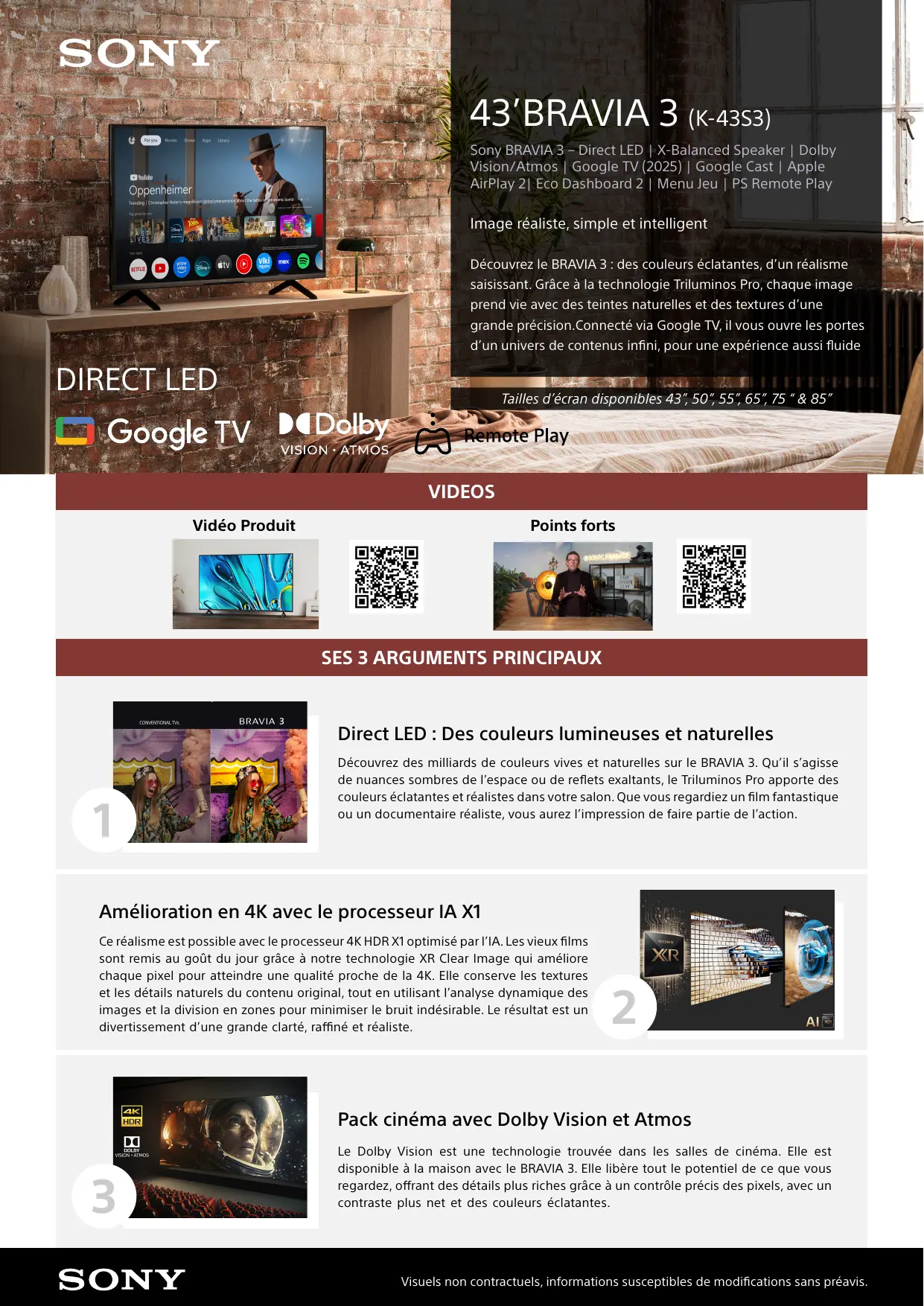 43BRAVIA3 - TV LED SONY - Notice d'utilisation et mode d'emploi gratuit