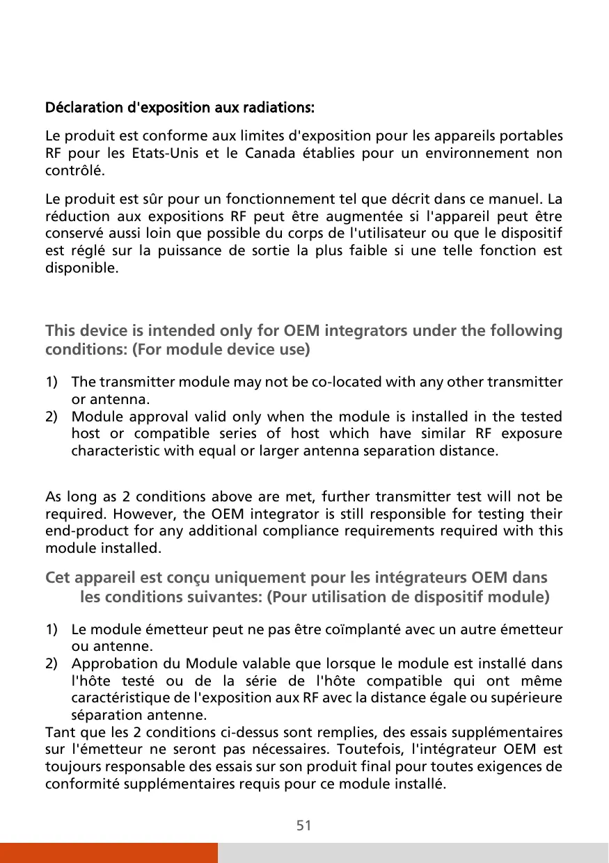 toujours responsable des essais sur son produit final pour toutes exigences de conformité supplémentaires requis pour ce module installé.