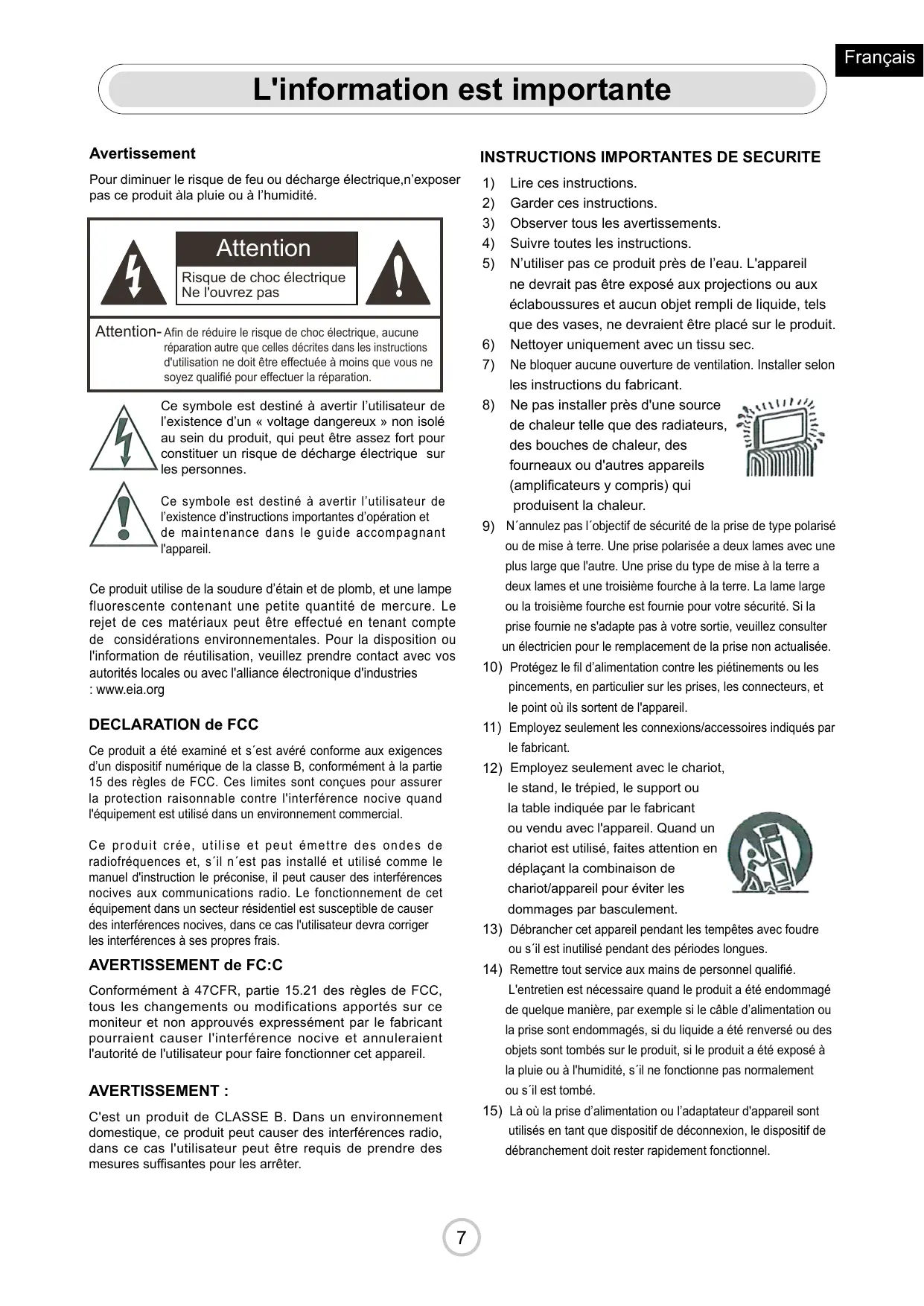 AVERTISSEMENT de FC:C Conformément à 47CFR, partie 15.21 des règles de FCC, tous les changements ou modifications apportés sur ce moniteur et non approuvés expressément par le fabricant pourraient causer l'interférence nocive et annuleraient l'autorité de l'utilisateur pour faire fonctionner cet appareil.