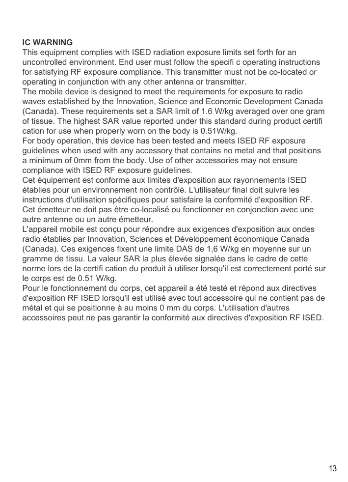 L'appareil mobile est conçu pour répondre aux exigences d'exposition aux ondes radio établies par Innovation, Sciences et Développement économique Canada (Canada). Ces exigences fixent une limite DAS de 1,6 W/kg en moyenne sur un gramme de tissu. La valeur SAR la plus élevée signalée dans le cadre de cette norme lors de la certifi cation du produit à utiliser lorsqu'il est correctement porté sur le corps est de 0.51 W/kg.