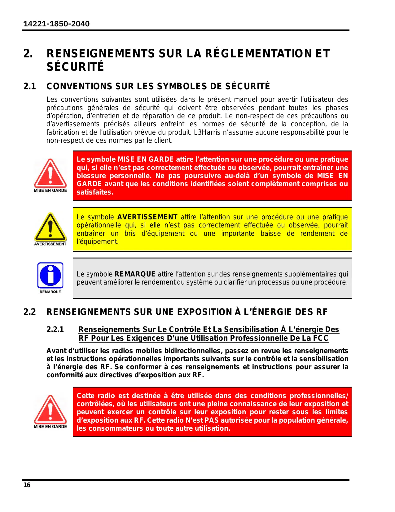 2.2.1 Renseignements Sur Le Contrôle Et La Sensibilisation À L'énergie Des RE Pour Les Exigences D'une Utilisation Professionnelle De La FCC 16 2.2.2 Règlements de la Federal Communications Commission (< Commission fédérale des communications » aux États-Unis) 2.3 CONFORMITÉ AUX NORMES D'EXPOSITION AUX RF 2.3.1 Antennes Mobiles 2.3.2 Accessoires Approuvés 2.3.3 Coordonnées... 2.4 INTERFÉRENCE DES RADIOFRÉQUENCES 24.1 Partie 15 de la FCC . 2.4.2 ISED Canada greniers ce 2.5 RENSEIGNEMENTS SUR LA FORMATION SUR LA SANTÉ ET LA SÉCURITÉ AU TRAVAIL nn 20 INTRODUCTION " 3.1 DESCRIPTION 21 3.2 XL-CH2 CONTROL HEAD 21 Les conventions suivantes sont utilisées dans le présent manuel pour avertir l'utilisateur des précautions générales de sécurité qui doivent être observées pendant toutes les phases d'opération, d'entretien et de réparation de ce produit. Le non-respect de ces précautions ou d’avertissements précisés ailleurs enfreint les normes de sécurité de la conception, de la fabrication et de l’utilisation prévue du produit. L3Harris n’assume aucune responsabilité pour le non-respect de ces normes par le client.