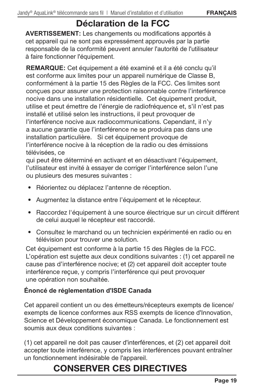 ? l'équipement suivant Si la télécommande sans | est une composante d'un dioummer pour le retour au spa) système AquaLink PDA, des options de conguration et de - le réchaueur (chauera en