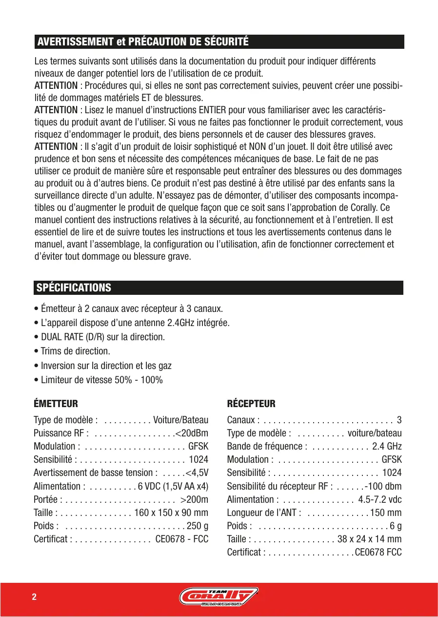 ATTENTION : Il s’agit d’un produit de loisir sophistiqué et NON d'un jouet. Il doit être utilisé avec prudence et bon sens et nécessite des compétences mécaniques de base. Le fait de ne pas utiliser ce produit de manière sûre et responsable peut entraîner des blessures ou des dommages au produit ou à d'autres biens. Ce produit n'est pas destiné à être utilisé par des enfants sans la surveillance directe d’un adulte. N'essayez pas de démonter, d'utiliser des composants incompa- tibles ou d'augmenter le produit de quelque façon que ce soit sans l'approbation de Corally. Ce manuel contient des instructions relatives à la sécurité, au fonctionnement et à l'entretien. Il est essentiel de lire et de suivre toutes les instructions et tous les avertissements contenus dans le manuel, avant l'assemblage, la configuration ou l’utilisation, afin de fonctionner correctement et d'éviter tout dommage ou blessure grave.