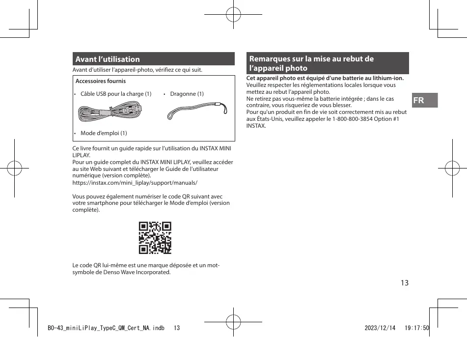 INSTAX Dans les pays hors de l'Union Européenne : Si vous souhaitez jeter ce produit, merci de contacter les autorités locales pour