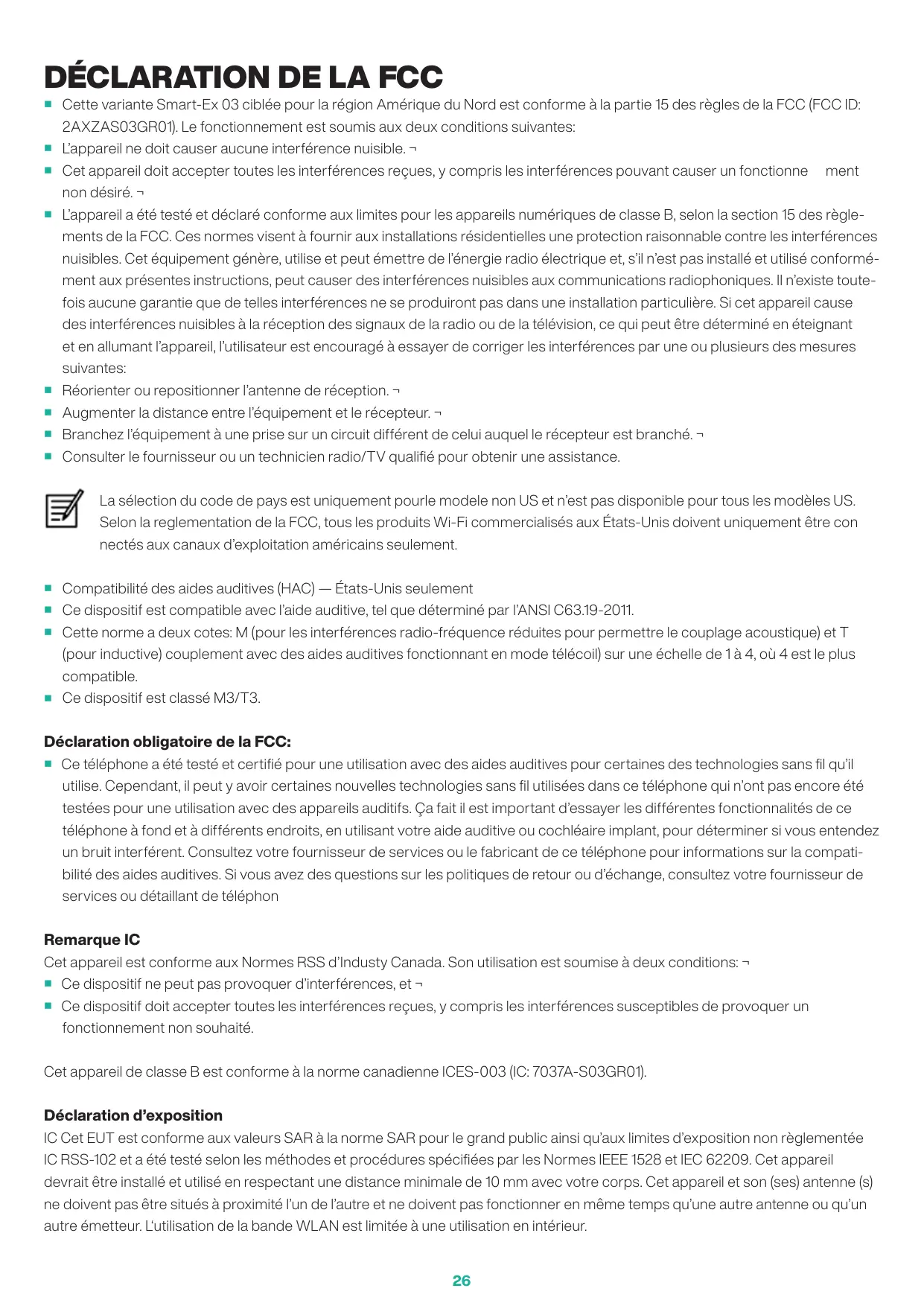 = Ce téléphone a été testé et certifié pour une utilisation avec des aides auditives pour certaines des technologies sans fil qu'il utilise. Cependant, il peut y avoir certaines nouvelles technologies sans fil utilisées dans ce téléphone qui n'ont pas encore été testées pour une utilisation avec des appareils auditifs. Ça fait il est important d'essayer les différentes fonctionnalités de ce téléphone à fond et à différents endroits, en utilisant votre aide auditive ou cochléaire implant, pour déterminer si vous entendez un bruit interférent. Consultez votre fournisseur de services ou le fabricant de ce téléphone pour informations sur la compati- bilité des aides auditives. Si vous avez des questions sur les politiques de retour ou d'échange, consultez votre fournisseur de services ou détaillant de téléphon