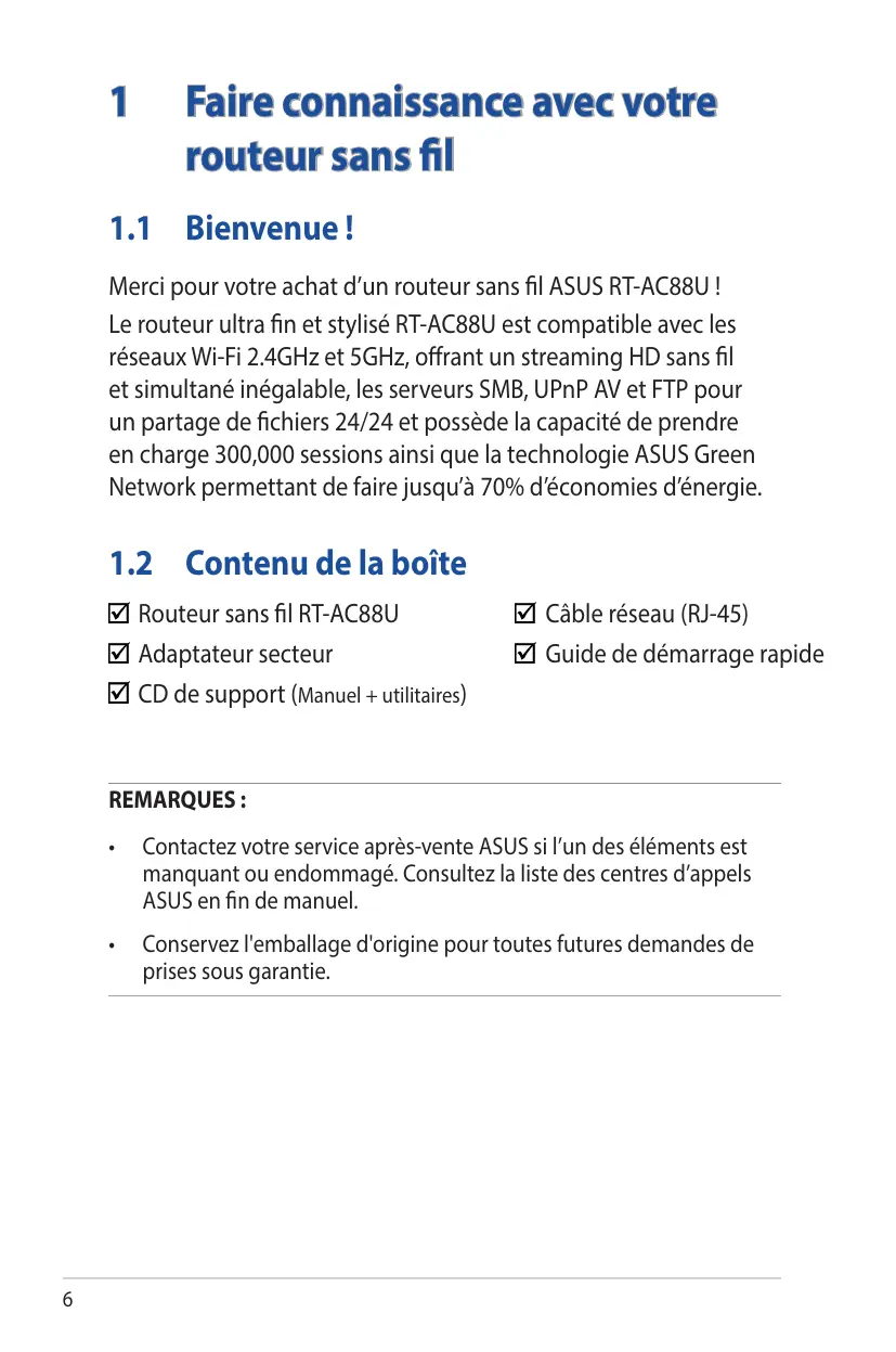 Routeur sans fil RT-AC88U Adaptateur secteur CD de support (Manuel + utilitaires) Câble réseau (RJ-45) Guide de démarrage rapide REMARQUES :