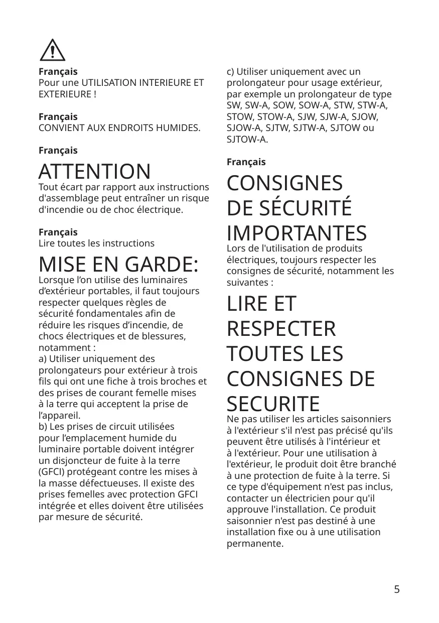 SW, SW-A, SOW, SOW-A, STW, STW-A, STOW, STOW-A, SJW, SJW-A, SJOW, LIRE ET RESPECTER TOUTES LES CONSIGNES DE SECURITE Ne pas utiliser les articles saisonniers à l'extérieur s'il n'est pas précisé qu'ils peuvent être utilisés à l'intérieur et