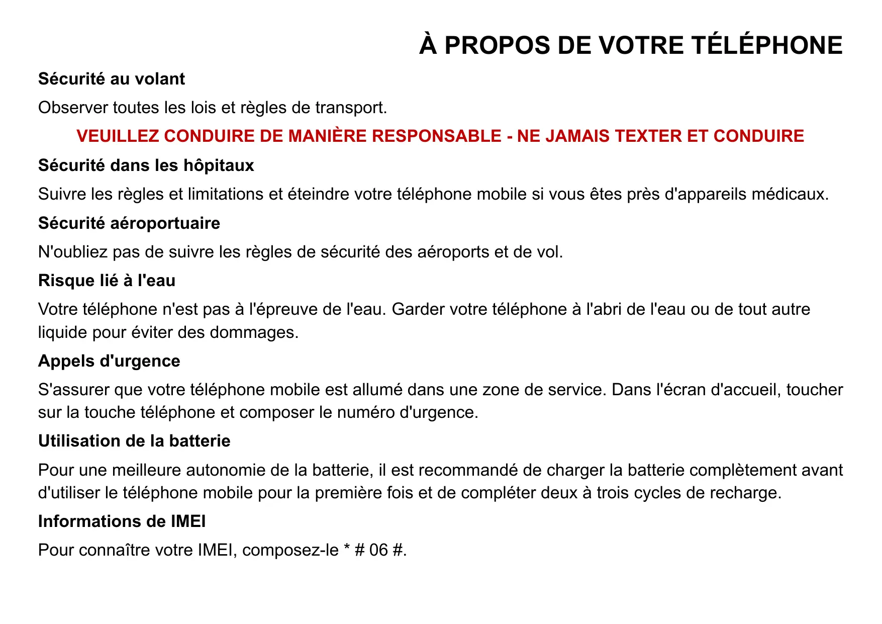 Suivre les règles et limitations et éteindre votre téléphone mobile si vous êtes près d'appareils médicaux. Sécurité aéroportuaire N'oubliez pas de suivre les règles de sécurité des aéroports et de vol. Risque lié à l'eau Votre téléphone n'est pas à l'épreuve de l'eau. Garder votre téléphone à l'abri de l'eau ou de tout autre liquide pour éviter des dommages. Appels d'urgence