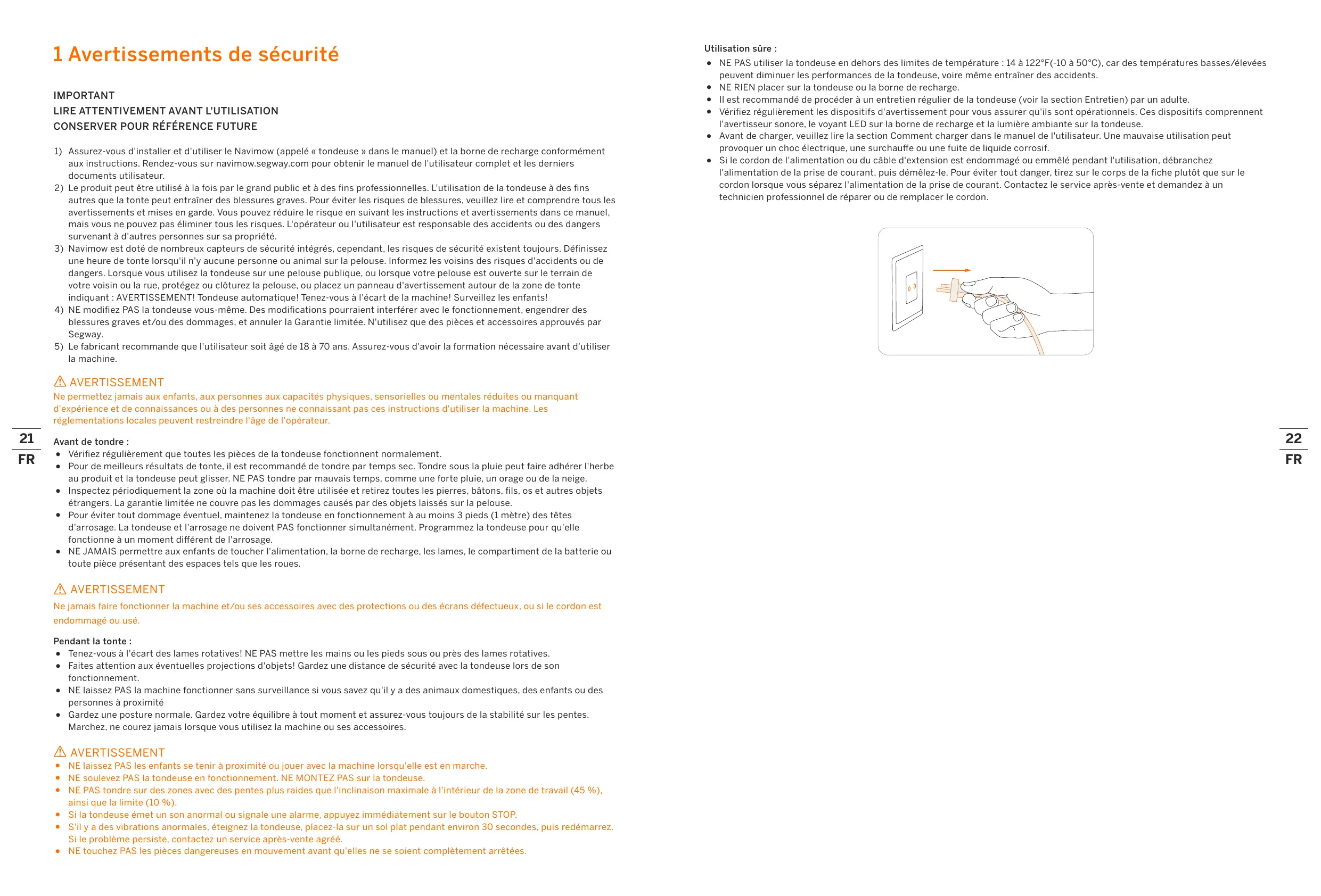 + NE JAMAIS permettre aux enfants de toucher l'alimentation, la borne de recharge, les lames, le compartiment de la batterie ou toute pièce présentant des espaces tels que les roues.