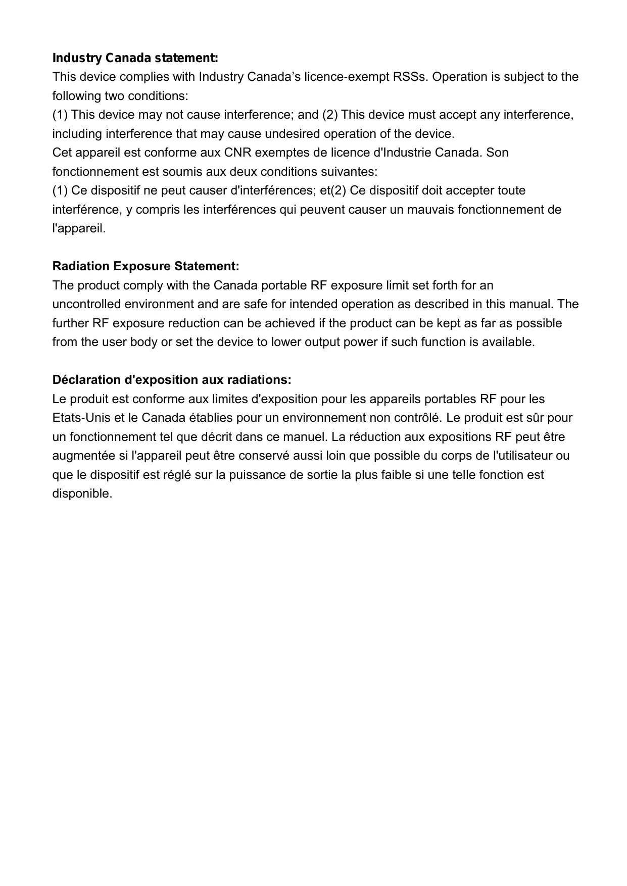 Industry Canada statement: This device complies with Industry Canada's licence-exempt RSSSs. Operation is subject to the following two conditions: (1) This device may not cause interference; and (2) This device must accept any interference, including interference that may cause undesired operation of the device. Cet appareil est conforme aux CNR exemptes de licence d'Industrie Canada. Son fonctionnement est soumis aux deux conditions suivantes: (1) Ce dispositif ne peut causer d'interférences; et(2) Ce dispositif doit accepter toute interférence, y compris les interférences qui peuvent causer un mauvais fonctionnement de l'appareil. Radiation Exposure Statement: The product comply with the Canada portable RF exposure limit set forth for an uncontrolled environment and are safe for intended operation as described in this manual. The further RF exposure reduction can be achieved if the product can be kept as far as possible from the user body or set the device to lower output power if such function is available. Déclaration d'exposition aux radiations: Le produit est conforme aux limites d'exposition pour les appareils portables RF pour les Etats-Unis et le Canada établies pour un environnement non contrôlé. Le produit est sûr pour un fonctionnement tel que décrit dans ce manuel. La réduction aux expositions RF peut être augmentée si l'appareil peut être conservé aussi loin que possible du corps de l'utilisateur ou que le dispositif est réglé sur la puissance de sortie la plus faible si une telle fonction est disponible.