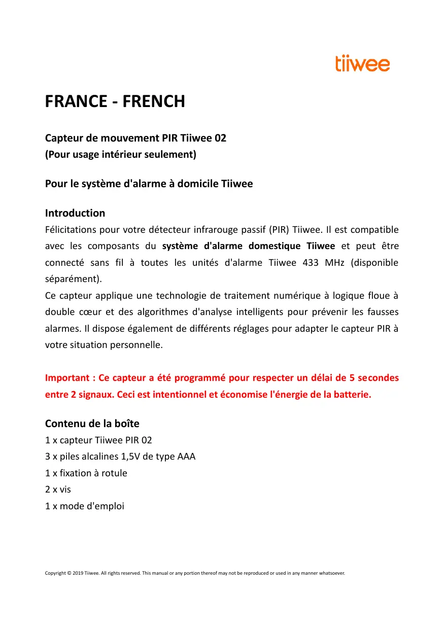 IMPORTANT : Les instructions pour l'appariement du capteur PIR avec le système d'alarme domestique Tiiwee sont incluses avec les unités d'alarme ou peuvent être consultées sur notre site Internet www.tiiwee.com ou sur l'un