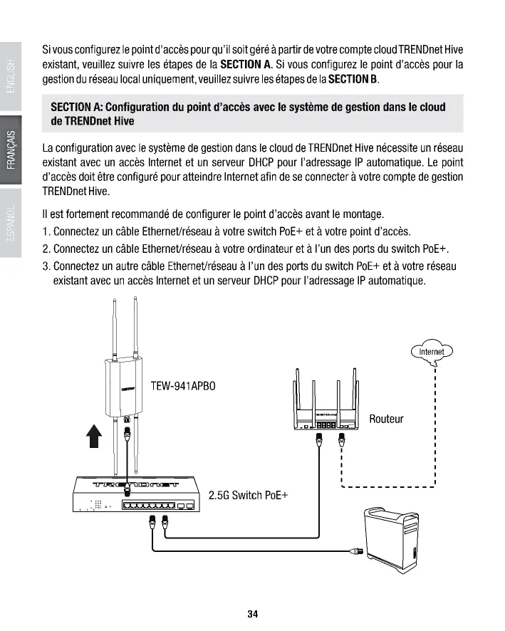 Sivous configurez le point d'accès pour qu'il soit géré à partir de votre compte cloud TRENDnet Hive existant, veuillez suivre les étapes de la SECTION A. Si vous configurez le point d'accès pour la gestion du réseau local uniquement, veuillez suivre les étapes de la SECTION B.