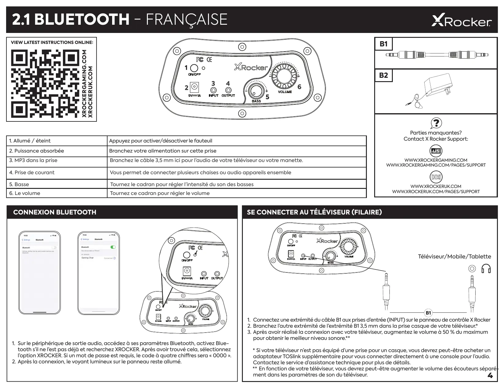 - Assurez-vous que vous avez bien une prise casque sur votre téléviseur. Cela sera généralement marqué par un symbole de casque ou “H/P OUT”. LES HAUT-PARLEURS STÉRÉO NE PRODUISENT PAS DE SON/LE son EST FAIBLE Veuillez vous assurer que le volume de l'appareil source est à un niveau plus élevé pour renforcer le signal audio. LES CÂBLES CONNECTÉS À MON x ROCKER ONT ÉTÉ CASSÉS ACCIDENTELLEMENT. Veuillez contacter l'assistance X Rocker pour ce problème. IL N'Y À PAS DE PRISE CASQUE SUR VOTRE TÉLÉVISION ? + Vous avez certainement besoin d'acheter un adaptateur TOSlink. Si vous n'êtes pas certain de ce que vous devez acheter, veuillez contacter X Rocker BESOIN D'AIDE SUPPLÉMENTAIRE ? CONTACTER L'ASSISTANCE X ROCKER