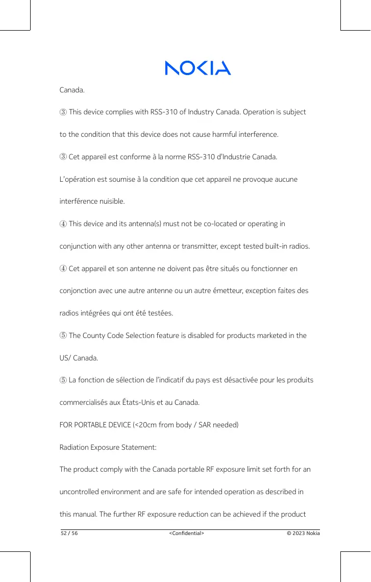 NOKIA Canada This device complies with RSS-310 of Industry Canada. Operation is subject to the condition that this device does not cause harmful interference. Cet appareil est conforme à la norme RSS-310 d'Industrie Canada. L'opération est soumise à la condition que cet appareil ne provoque aucune interférence nuisible. This device and its antenna(s) must not be co-located or operating in conjunction with any other antenna or transmitter, except tested built-in radios. Cet appareïl et son antenne ne doivent pas être situés ou fonctionner en conjonction avec une autre antenne ou un autre émetteur, exception faites des radios intégrées qui ont été testées. The County Code Selection feature is disabled for products marketed in the US/ Canada. ® La fonction de sélection de l'indicatif du pays est désactivée pour les produits commercialisés aux États-Unis et au Canada. FOR PORTABLE DEVICE (<20cm from body / SAR needed Radiation Exposure Statement: The product comply with the Canada portable RF exposure limit set forth for an uncontrolled environment and are safe for intended operation as described in this manual. The further RF exposure reduction can be achieved if the product HE] <Cnents CETTE