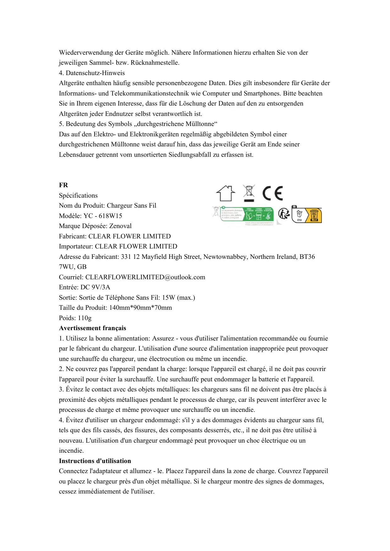 YC-618W15 - Chargeur sans fil Zenoval - Notice d'utilisation et mode d'emploi gratuit