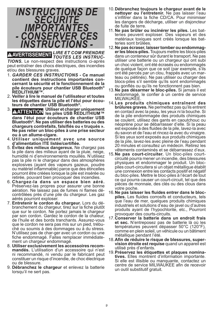 à l'abri de l'humidité. Ne pas les entreposer dans un endroit humide où la corrosion des bornes peut survenir. Comme pour d'autres types de batteries, une perte permanente de capacité peut survenir si le bloc-piles est entreposé pendant longtemps à haute température (50°C/120°F). Les piles Li-ion MILWAUKEE maintiennent leur charge pendant plus longtemps que les autres types de piles. Après un an d'entreposage, rechargez le bloc-piles comme