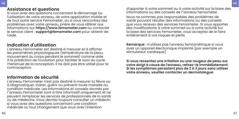 L'anneau Femometer n'est pas destiné à mesurer la fièvre où à diagnostiquer traiter, guerir ou prévenir toute maladie où condition médicale. Les informations et conseils donnés par l'anneau Femometer sont à tire informatif uniquement et ne suvent remplacer les services de professionnels dela santé Bu de médecins. Vous devrez toujours consulter un médecin Si vous avez des questions concernant une condition médicale ou tout Changement que Vous avez intention