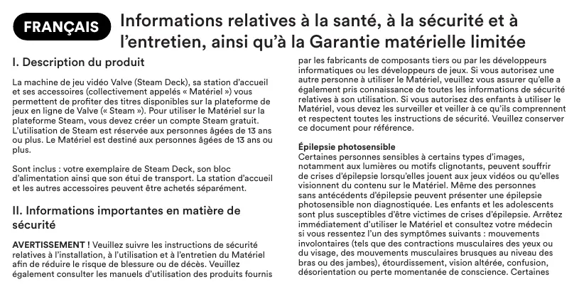Résumé de la Garantie limitée. Valve garantit que votre produit est exempt de tout défaut matériel ou de fabrication dans des conditions normales d'utilisation, pendant un (1) an à compter