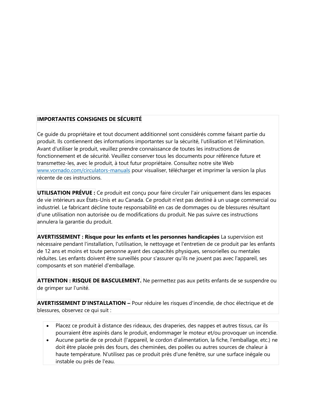 UTILISATION PRÉVUE : Ce produit est conçu pour faire circuler l'air uniquement dans les espaces de vie intérieurs aux États-Unis et au Canada. Ce produit n'est pas destiné à un usage commercial où industriel. Le fabricant décline toute responsabilité en cas de dommages ou de blessures résultant d'une utilisation non autorisée ou de modifications du produit. Ne pas suivre ces instructions annulera la garantie du produit.