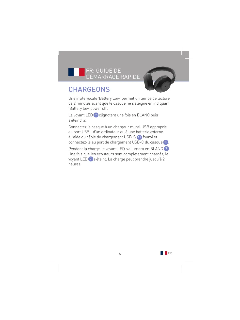 S'iLn'y a pas de connexion Bluetooth après 5 minutes, le voyant LED @ commencera à clignater en BLEU et BLANC pendant 60 secandes. Le casque s'éteindra alors automatiquement en confirmant avec ‘Power off et le voyant LED @ clignotera une fois en BLANC puis s'éteindra.